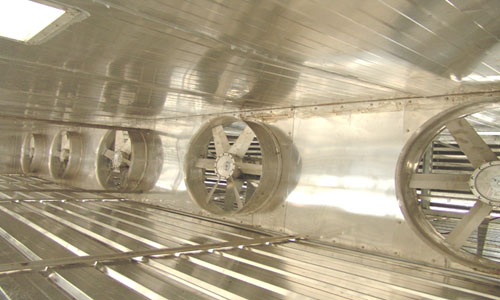 There is a guide plate at the upper part in the kiln, which parallel with the upper cover plate, the guide plate shorter than the depth of kiln, that means it left air-vent both ends, the guide plate separate kiln in two parts, upper side is the fan room which lower, down side is the drying room which higher. The cycling fan installed in the middle of the fan room, and multiple paralleling as usual.The heater installed in two sides or one side of the fan room, the wind made by fan pass through the heater to heat, then enter into the space of timber from one side, flow through the timber for heat exchange, makes the timber heated warming, and take away the moisture steam from the timber surface, flowing from the other side of the timber, pass through the other side of the vents flowing into the air inlet port of the fan, forming circumstance airflow in the kiln, made the timber heating and warming constantly.